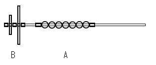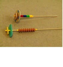 材料 支持棒 :3mmφ 竹ひご 凹凸部分 :ビーズ玉 ストッパー:アイロンビーズ プロペラ :木製 大と小、穴径4mm 擦り棒 :5mmφ 丸棒 作り方 ①プロペラ軸を扁平加工します。下図のように支持棒の先端2ヶ所をそれぞれの扁平面がずれるように、扁平に削ります(加工済みのものを使うこともあります)。 ②プロペラに模様や色を付けます。 ③下図のAのように、支持棒にビーズ玉7ケを通し、ストッパーで挟んで止めます。 ④続いて、下図のBのように、支持棒のプロペラ軸に、ビーズ側から、ストッパー⇒プロペラ大⇒中間ストッパー⇒プロペラ小⇒先端ストッパーの順に通して止めます。 注意! 軸の扁平部分は薄く、折れやすいので、気をつけて扱いましょう。 材料 扁平軸の加工 ビーズ玉、プロペラの組み入れ |