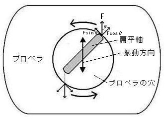 扁平軸による回転原理 扁平軸の振動方向と扁平面の傾きの角度が変わるためです。 擦り棒でビーズ玉を擦ると、扁平軸が振動して、プロペラの穴に触れ、力Fでプロペラを押します。このとき、振動方向と扁平軸の傾き(θ)によって、 プロペラは回転力(Fsinθ)と摩擦力(μFcosθ)を受け、傾きが正のときは反時計方向、負のときは時計方向に回ります。 傾きが小さいと回転力は小さくなり、傾きが大きいと摩擦力が小さくなるため、傾きが0゚と90゚近くでは回りません。 応用例については作品「がりがりーくるくる」を参照してください。 扁平軸による回転原理 そろばん玉の利用 |