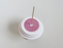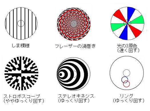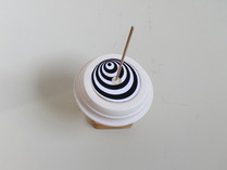 2.コマを作る (1)ヤジロベエ型のコマ ①ヤジロベエ型のコマを作ります。 お皿の裏の中心にクッション材を貼り、皿ごと穴(3mm)をあけます。クッション材の穴に 竹棒のとがった方を通し、お皿から2ミリくらい出します。 ②台にのせて、ゆっくり回しても倒れないか、たしかめてみよう。 ③この性質を利用して、模様を回した時の変化を見てみよう。 ・ 回すと、どんな形や色になるかを考えてみよう。 ・ 紙から模様を切り抜いて、コマにのせて回してみよう。思ったようになったかな? ・ また、白地のものに自分で模様を描いて、回してみよう。 注意! 「錯視のもの」は長くじっと見つづけないようにしよう。 模様を回してみる