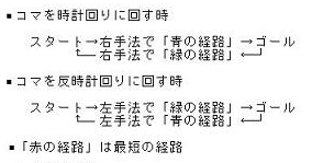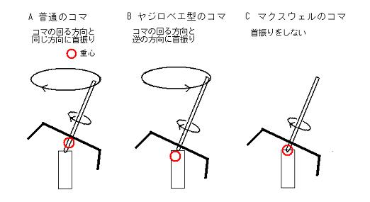 | しくみ コマ ヤジロベエ型のコマは重心がコマの軸より下にあり、倒れないコマです。ゆっくり回すことができます。 マクスウェル型のコマはコマの重心が支点になっているので、重力のモーメントが働かず、首振り(歳差運動)をしません。軸が物に触れて、転がりながら摩擦で動くとき、ジャイロ効果によって触れている物を押すため、形をなぞりながら進みます。 迷路 右(左)手法は右(左)手で迷路の右(左)側の壁に触れながら進んで脱出する方法です。