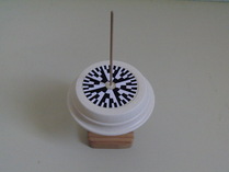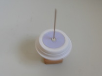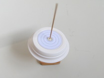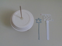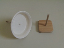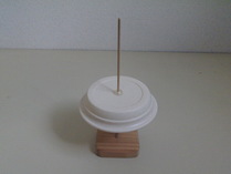 | 工作 材料 コマの台 :板(70×70×1.3cm)、丸棒(8mmφ) コマ :植木鉢用プラ皿(上12cmー底8cmφ)、軸(3mmφ竹棒) クッション材(ウレタン製、粘着剤付き、径13mm) 模様の紙 :模様と無地の円形を印刷したもの 針金 :1mmφ 迷路 :プラスチック製(加工済) 1.台を作る コマを乗せて回す台を作ります。丸棒の凹みのあるほうを上にして、四角い板の穴に差 し込みます。