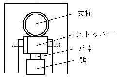 | しくみ 伝承玩具「きつつき」の原理でカタカタ降り、「ガリガリとんぼ」の原理でプロペラが回ります。 機台にはバネと錘からなり、揺動する「てこ式ストッパー」が支柱を斜めに押さえるように付いています。 ハンドルを回すと滑車で機台が上がります。ハンドルを放すと、機台の重さでカタカタ振動しながら、旋回して降りていきます。プロペラはこの振動で回ります。 機台が降りる時、ハンドル軸が戻る力で、コーヒーカップの台全体が回り、各カップも周りの棒に触れて回ります。また、軸のカムによって父さんくまが飛行機を追って見上げます。 参考 伝承玩具「きつつき」と「ガリガリとんぼ」は関連伝承玩具を参照してください。 てこ式ストッパー |