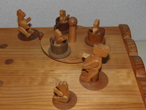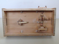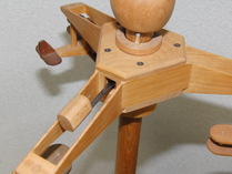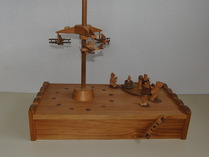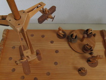 | こぼれ話 ・・・体験型展示・・・ この「遊び具」は仕掛けは単純なのですが、子供達が動かすときに、ハンドルを回しすぎたり、滑車の糸が外れたりして、故障が多いのが難点です。もう一工夫、改良の余地があるようです。 さて、「遊び具」・おもちゃを見てもらうとき、演示のみの展示と体験できる展示がありますが、子供達にふしぎさ、面白さを実感してもらいたいのとその反応が見たいこともあって、展示のときは自由に動かしてもらっています。 ただ、初めて展示したときは故障続きで、修理に追われ、十分見てもらうことすらもできませんでした。 1つには子供達が普段こうした木製で繊細な仕掛けのある「遊び具」に触れることがなく、極端な場合にはゲームセンターの「もぐらたたき」のように扱ってしまうことです。 説明すると分ってもらえるので、しくみを解説し、ともに動かしてみるスタッフが必要になります。よく協力していただいているボランティアの方や科学の祭典での中高生ボランティアには本当に助けられています。 もう1つは「遊び具」側の対応です。力のかかるところ、壊れやすいところを耐えれるように強固にしたり、トラブルから保護したり、回避したりする工夫が必要になります。 他の「遊び具」でも、レバーをたたきすぎてよく壊れました。太く丈夫にしたり、必要以上に押さないよう柔らかいストッパーを付けました。また、何か支障があって動かなくなっても、力まかせに動かそうとして、歯車や軸を壊してしまうことがよくあります。歯車をプーリに代えて過度な力がかかるとスリップするようにしました。 こうした「遊び具」でも過負荷などから保護するヒューズのような工夫も必要なことなど、自由に動かしてもらうなかでいろいろ教えられました。 |