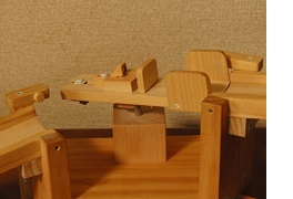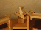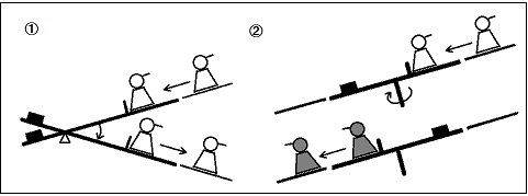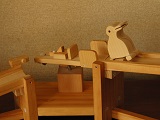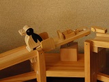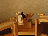 | こぼれ話 ・ターンテーブルにはレコードの回転盤や車両の向きを変える大きな転車台等がありますが、工業用でも作業台として作業をしやすくしたり、搬送で物の方向を変えたり、移動するのに使われています。回転軸を傾けて斜面にすると、動力を使わずに運ぶものの重さで回転移動し、ものが離れるとひとりでに戻るようにできます。ここでのターンテーブルも同じ原理を利用しています。 ・変身トコトコとして両方向に歩くようにするには、前述のように可動脚の前側と後側に支点となる部分が必要ですが、「ひと」のように立って二足歩行するものでは、片足だけで、もう一つの支点部分がうまく取れません。これが出来れば、バリエーションが広がるので今後の課題です。 ・ターンテーブル式やシーソー式の方向転換部を坂道にいくつか組み込み、トコトコ人形をいろいろ変身させてみるのも、面白いと思っています。 |
