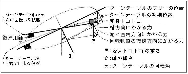 | しくみ トコトコ歩く「ウサギ」は裏返すと「ペンギン」になるように作ってあります。坂をトコトコ降りてきた「ウサギ」はターンテーブルで裏返しになって、向きが変わり、「ペンギン」に変身します。 (1)変身トコトコ ①形態 図1 図2 ![]() ![]() だまし絵で知られる「ウサギとアヒル」(図1)は、いわゆる多義図形で、耳と見るか 、くちばしと見るかでウサギに見えたり、アヒルに見えたりします。普通は、これが右方向に歩くと思ってみると、耳を持つウサギに、左方向に歩くと思うとくちばしをもつアヒルに見えます。変身トコトコではこれをヒントにして、どちらにもとれるような部分(多義部分)を体の前か後ろに入れています。ただ、歩く向きを変えても、後ろ向きに歩いていると思ってしまうと、変身しないで、後ろ向きの「ウサギ」に見えてしまうことがあります。 変身トコトコの歩く方向を変えるには、図2の①のように見える面がそのまま変わらないシーソー方式か、②のように回転により裏返って、裏側が見えるターンテーブル方式が考えられます。 ターンテーブル方式のように見える面が変われば、それぞれの面にその動物の絵柄を加えると、多義部分が違って見える面白さを残したまま、変身がはっきりします。 図3に実際の変身トコトコを示します。「ウサギ-ペンギン」ではウサギの耳とペンギンのくちばし、「リス-アヒル」ではリスの尾とアヒルの胸から頭、「ゾウ-クマ」ではゾウの鼻とトラの尾が多義部分で、その動物にあった絵柄を加えています。 図3 ②両方向歩き よく見受けられる、一方向に歩くタイプのトコトコ人形は前脚を胴に固定し、その後ろ側に軸を介して動く後脚を付け、進む方向の前後に体が揺れると、固定脚の前脚を支点に可動脚を振り出すことで歩いていきます。また、重心は軸より後ろで、可動脚は軸より後ろに揺れるようになっています。 変身トコトコではターンテーブルで歩く向きが変わって変身するので、前向きにも、後ろ向きにも歩けるようにしています。 a.可動脚の前後に揺れの支点となる部分を設ける。 可動脚の前側と後ろ側に脚や体の一部を利用して、支点となる部分を設けます。 「ウサギ-ペンギン」と「リス-アヒル」では足と尻尾、「ゾウ-トラ」では足と鼻、尻尾をそれぞれ支点部分としています。 b.可動脚がほぼ同じように前後に揺れるようにする。 可動脚が前後に同じくらい振れるように、軸は前後の脚等のほぼ中間とし、重さのバランスも軸の前後で同じくらいにします。そして、これ等を基本として、可動脚とその前後の支点となる底面のカーブも含めて、両方向に歩くよう調整します。 (2)ターンテーブル(回転台) 変身トコトコの歩く方向を変えるため、ターンテーブルを利用しています。 図4 ここでのターンテーブル(図4)は言わば、坂の中ほどの一部を切り離し、斜めに回転するようにしたものです。 上下の坂とターンテーブルを一直線状に接続すると、人形がターンテーブルに移っても、その重さによる回転力が働かないことと装置全体の安定感から、上と下の坂を180度より少し小さい交差角でターンテーブルにつなげ、ターンテーブルは停止棒でその角度だけ回るようにしています。 変身トコトコが上の坂から、ターンテーブルに移ると、その重さで回転し、裏返しにな り、向きが変わって下の坂に移ります。ターンテーブルは復帰用錘の重さで逆方向に回 り、元の初期位置に戻ります。 図5はターンテーブル部を簡略化して示したものです。回転軸は坂と同じ角度(θ)だけ傾いていて、「フリーの位置」は復帰用錘の重さで止まる位置で、ほぼ上下の坂と直線になる状態です。「初期位置」と「下端で止まる位置」は鈍角に交差する上、下の坂を接続したところです。 変身トコトコを載せたターンテーブルがフリーの位置から回転角αの位置にある時、変身トコトコの重さWによって軸方向の力W1=Wcosθ、軸と直角方向の力W2=(Wsinθ)cosα、回転軌道の接線方向の力W3=(Wsinθ)sinα が働きます。力のモーメントは W3×(変身トコトコの重心位置と軸との距離) で、ターンテーブルを回す主な回転力となります。 復帰用錘を含むターンテーブル自体にもその重さ(Wt)によって、同様の力が働きます。 図5 ![]() ①ターンテーブルの回転 a.力のモーメント 変身トコトコが上の坂からターンテーブルに移り始めると、その重さによる力のモーメントが働いてすぐに回るので、ターンテーブルと坂に挟まれて止まってしまいます。このため軸の少し手前に押し板を設け、それにつながる棒が坂の溝に入るようにしたストッパーを付けました。人形が押し板を押すと棒が溝から外れ、ストッパーが解放されます。押し板の戻りには押しバネを使えばいいのですが、ごくわずかな力で働く柔らかいものが手に入らず、小さなネオジム磁石を使っています。 変身トコトコが押し板を押し、ストッパーが外れて回る時、変身トコトコ(重さW)による力のモーメントをMw、復帰用錘
