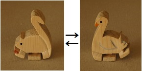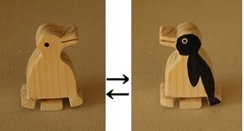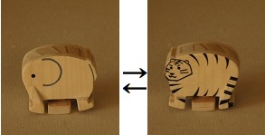 「ウサギ」が坂をトコトコ歩いて降りていき、途中のターンテーブル(回転台)で向きを変え、「ペンギン」になり、坂をトコトコ降ります。他に「リス」は「アヒル」に、「ゾウ」は「トラ」に変身します。なぜ? |