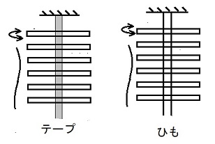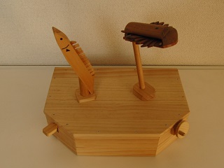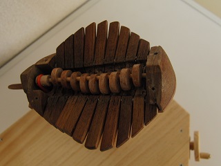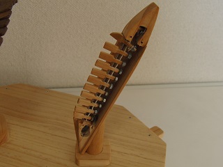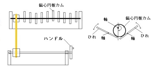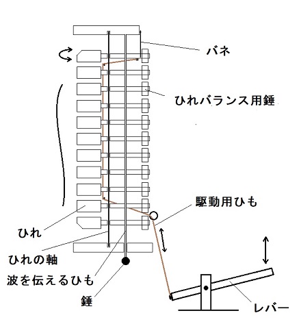 | しくみ 「アカエイ」のひれはカムを使って、「タチウオ」は波の実験で使われる〈レイリーのすだれ〉*を応用して、波のように動かしています。 1.「アカエイ」のしくみ 図1 図2 ![]() ![]() 図1は「アカエイ」のしくみ部分の写真、図2はカムによってひれを動かすしくみを示しています。 一連の円板カムは偏心カムで、それぞれは一定角度(30°) ずつずらして回転軸に固定しています。 ハンドルを回すとベルトを介してこの軸が回り、カムが各ひれを順に押し、正弦曲線状に波打ちます。 左右のひれの中間の真上にカムの軸があるので、両ひれは少しずれますがカムに当たり、ほぼ対称に揺れます。 ![]() 2.「タチウオ」のしくみ 図4 図3 図3は「タチウオ」のしくみ部分の写真、図4はその機構 を示しています。 各ひれは、回転できるよう軸に通し、細いひもで間隔が 一定になるように連結し、下部に付けた錘で軽く引張っ ています。 また、ひれのバランスをとり、慣性を大きくするため、ひれの中側の端に錘(ナット)を付けています。、 レバーを押すと駆動用のひもによって一番上のひれが引かれ、離すとバネで戻ります。レバーをトントンと繰り返し押すと左右に揺れ、この揺れが波を伝えるひもを介して、各ひれに順々に伝わり、ひれ全体が波打ちます。 この「ひれウエーブ」は全体を少しコンパクトにしょうと作り始めたのですが、どうしても仕掛けはある程度の大きさが必要で、その部分が厚くなり、アカエイやタチウオの扁平さが出せず、デザイン的に問題を残しました。 タチウオでは仕掛けに〈レイリーのすだれ〉を応用してみましたが、他には例をほとんど見かけないので、初チャレンジと思っています。原理を生かしながら機構を変えてるため、揺れる棒に相当するひれが軸周りに対称でなく、ひれの重さのバランスををとる必要があります。また、波を伝えるひもが1本なので、ひれ同士をよりきちっと等間隔にそろえることと、その張力の調整(錘の調整)も必要です。コンパクトにしたためこれ等の精度が出にくく、波がちょっと不ぞろいになっています。やはりもう少し大きく作らないと難しそうです。 図5*「レイリーのすだれ 図5のように一定の間隔で棒を並べ、中央をテープで貼って止めたり、 2本の紐で一定間隔で止めます。 上端の棒を揺らすと、テープや2本の紐のねじれが順に伝わって、棒が 波のように揺れます。 ストローや割りばしをセロテープ止めて、簡易に作ることができます。 本格的なウエーブマシン(波動実験器)は金属棒の中央を板バネやロッド スプリング等で固定した水平すだれタイプのもので、波の伝わり方や、 基本的な性質が観察できます。 |