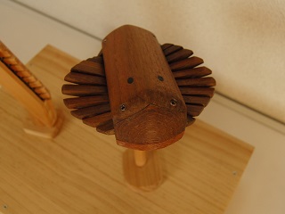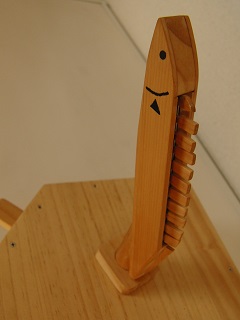 | こぼれ話 〇波の動きを取り入れた、木のからくりモデルも、波の動きにつれて船や魚が動くもの、くねくねと虫が動くようにしたものなどいろいろ作られています。今回は魚のひれが波打つのを見て、魚にしようと思いました。 エイの仲間はマンタのように、胸ひれを鳥が羽ばたくように動かすものもいますが、「アカエイ」は波打つように動かすので、まずこれにしました。 「アカエイ」のひし形状の扁平な胸びれは先の方が薄く、しなやかにウエーブします。目は背中側にあるのですが、お腹側にある鼻が目に見え、その下に口があるので、下から見ると笑っているように見えます。その下の左右の点々はえら穴で、サメは体の側面にあるので区別できるそうです。 そして、たまたまTVを見ていたら、さかなクンが解説する番組で「タチウオ」を取り上げていて、その背びれが見事に波打つのを見て、もう一つはこれにしました。 「タチウオ」は銀色で太刀のよう見え、透き通った大きな背びれがヒラヒラときれいに波打ちます。この発達した背びれによって、立ち泳ぎも得意で、頭上の魚に気付かれることなく素早くとびつき、とらえて食べるそうです。 「アカエイ」も「タチウオ」も魚としては変わっいますが、いずれも進化の一端が伺えて面白いですね。 |