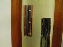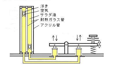 2つの耐熱ガラス管にサラダ油を満たしそれぞれの管内の液を交互に加圧と減圧ができるようになっています。 「浮き」の空気量を調節して、一方はギリギリ浮くように、もう一方はギリギリ沈むようにして、それぞれのガラス管に入れます。 それらの2つの耐熱ガラス管をさらにアクリル管に入れ、サラダ油で満たしてあります。 「浮き」が浮いているガラス管の液を加圧すると、「浮き」の空気の体積が減り、浮力が小さくなって、沈みます。この時、もう一方の沈んでいる「浮き」のガラス管の液は減圧され、空気の体積が増えて、 浮き上ります(アルキメデスの原理とパスカルの原理による浮沈子のしくみ)。 耐熱ガラス(パイレックス)とサラダ油の光の屈折率がほぼ1.47でガラス管はほとんど見えません。このため、ノブを回してそれぞれの管の液を加圧と減圧に切り替えると、2つの「浮き」は同じ液の中で互い違いに浮いたり、 沈んだりするように見えます(消えるガラス)。 参考 ・消えるガラス棒 P.Dohertyほか、広井ほか訳:「絵を映す魔法の杖 光と色」丸善 (1997) ・屈折率 作品「くるりんくるりん」を参照してください。