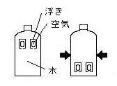 ノブを回すと、液中の2つの「浮き」の一方が浮き、もう一方は沈みます。 ノブを戻すと、浮いてる「浮き」が沈み、沈んでいる「浮き」が浮きます。 なぜ? どんなしくみで「浮き」は同時に一方が浮き、もう一方は沈むのだろう? |