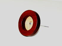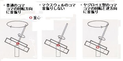 | しくみ コマの重心が軸の下端になっています(マクスウェルのコマ)。コマの重心が支点にあるので、重力のモーメントが働かず、 軸は首振り運動(歳差運動)をしません。 一方、回転する軸が迷路に触れると、摩擦によって迷路に沿う方向に軸を傾けようとする力Fが働きます。 この時、軸はジャイロ効果によって、力Fと直角方向の迷路側に動こうとして、迷路の側面を力Mで押します。このため、軸は回転しながら迷路に沿って進みます。 迷路の最短距離は赤の経路ですが、このコマでは時計回りでスタートすると、緑の経路をとります。 これはいわゆる右手法に相当し、ゴールから戻る時は青の経路をとります。 反時計回りでは左側の壁に触れながら進む青の経路をとり、緑の経路で戻ります。 参考 ・マクスウェルのコマ 戸田:「おもちゃの科学(5)」 日本評論社 (1996) 八木田、山口:「独楽あそび 回転の秘密」 平凡社 (1979) ・迷路 京都幼児教室の「迷路」を一部変更 マクスウェルのコマ ジャイロ効果 |