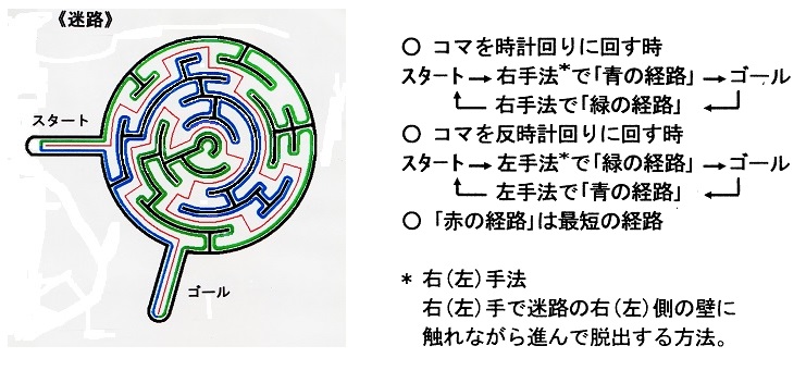 | こぼれ話 ・・・迷路脱出法・・・ スタートとゴールの壁がつながっていなくて、いずれかが迷路の内部にあったり、立体交差のある迷路では「右手法(左手法)」では循環路になることがあり、使えません。 そこで右手法を拡張した方法もいくつか考えられています。経路探索の深さ優先探索は循環路のある迷路でも解くことができます。ただし無駄な往復も多く(通る道のりの最大は迷路の全長の2倍未満)、たとえば巨大な鍾乳洞で、不運な場合は、出口に行き着く前に力尽きてしまうといったこともありうるそうです。 最短の経路を見出す手法(最短経路探索)も考えられていて、コンピュータによる計算が必要ですが、最短路マップを使う手法が効率がよいとのことです。 これらは車のナビゲーションシステムなどにも使われています。 参考 徳山:「はみだし幾何学」 岩波書店 (1994) |