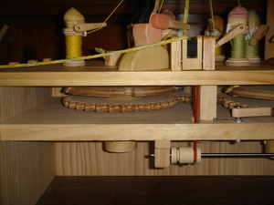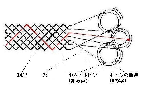 | しくみ 工業用の組機の機構で糸を組み、紐を作っています。 小人(組錘に相当し、ボビンに糸が巻かれています)が順々に8の字型に進んで、糸を交錯させ(組む)、組紐を作ります。 ボビンの糸の色を変えたり、小人への配置の順序を変えると組紐の柄が変わります。 できた組紐は送りローラで引き出しています。 各糸はボビンの摩擦抵抗で張力を与え、人形の腕の動きでたるみを取っています。 糸張力には限度があるので、紐の組ぐあいはゆるめになります。 小人達がぶつからないように順々に8の字に進む機構は実に巧妙です。 詳しくは古い本ですが下記を参照してください。 参考 ・米田:「編組工学」 技報堂 (1953) ・「編組・縫製」 実教出版(1982) |