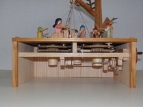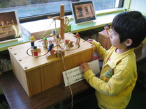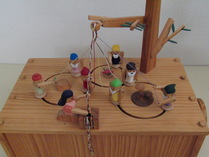 ハンドルを回すと、7人の小人が白雪姫のために糸を組んで、紐を作ります。 なぜ? どんなしくみで糸から紐ができるのだろう? |
