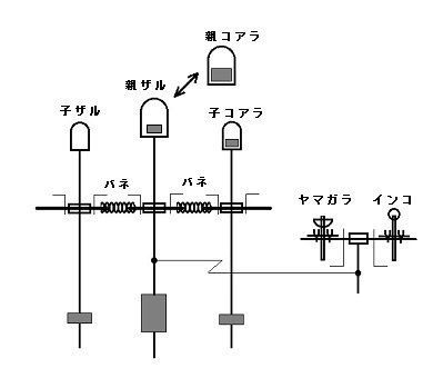 | しくみ 振り子の共振現象を利用しています。 それぞれの動物達を物理振り子(剛体振り子)とし、振り子の支点より上と下の重さを調整して所定の固有振動数にしています。 親コアラ、子コアラとインコの固有振動数を同じにし、親ザル、子ザルとヤマガラはその2倍の固有振動数にしています。 親用の振り子と子用の振り子の支点軸をバネで接続し、親側の揺れを子側にゆるく伝えています。また、親用の軸の回転を鳥側に伝えて、鳥の振り子の支点が揺れるようになっています。 これによって中央の振り子で親コアラを揺らすと、同じ固有振動数の子コアラとインコが大きく揺れ、親ザルを揺らすと子ザルとヤマガラが大きく揺れます。親が違う子供はわずかにしか揺れませんが、親を揺らす時に子供が揺れているとそれらの位相の関係で、子供が揺れてしまうので、揺れを止めてから親を揺らします。 ![]() |