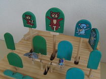 中央の振り子に親のコアラを乗せて揺らすと、子供のコアラと森の仲間のインコが大きく揺れます。親ザルに換えて揺らすと子ザルとヤマガラが大きく揺れます。 なぜ? どんなしくみで親を揺らすとその子供たちが揺れるのだろう? |