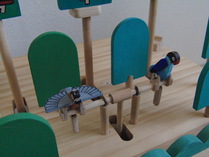 | こぼれ話 遊び具にとって「振り子」は興味ある題材です。連成振り子で共振する動きがおもしろく、この遊び具を作りました。 コンパクトでゆっくり揺らすために物理振り子(剛体振り子)にしていますが、錘の位置で振動数が複雑に変わってしまいます。また共振しないほうをあまり揺らさないように固有振動数や位相との関係、振り子の重さ(慣性モーメント)の兼ね合いなどをさらに検討したり、全体として揺れのパワーを大きく、長持ちさせるなど工夫の余地はまだありそうです。 地震計のしくみはいろいろ参考になると思っています。 |