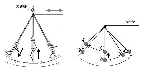 | こぼれ話 ブランコこぎはパラメータ励振の例としてよく取り上げられ、力学的に解析もされています。ただ、実際のブランコのこぎ方はいろいろあり、パラメータ励振だけでなく、いくつかの要素が関わっているようです。 このため実際のブランコと乗っている人の各部の寸法や重さに対応したミニ模型にするのが理想ですが、ここでは単純化して重心の移動を強調するよう、立ちこぎ人形は上体を、座りこぎ人形は足を重くしています。 また、ミニにすると振り子として振動数が大きくなり、かなり速くなってしまいます。減速用の錘も抵抗を加えるわけですから、遅くなる反面、加振効果が低くなることがあります。 そんなわけで実験装置ではなく遊び具として、ブランコこぎに興味を持ち、その理屈を考えるきっかけになればと思っています。 |