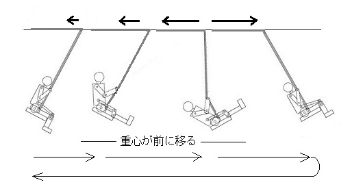 | しくみ ブランコを揺れにあわせて繰り返し押してもらうとだんだん大きく揺れます。ブランコこぎは乗っている人が自分の力でブランコを揺らしているので、しくみはちょっと違います。 立ちこぎ この「立ちこぎブランコ」はレバーを押すと体が引き上げられ、レバーを放すと体が下がるようになっており、揺れの方向には力は働きません。初めに少し揺らし、ブランコが後ろから前に揺れる時にレバーを押し、戻りの折り返し前にレバーを放します。これを繰り返すと揺れがだんだん大きくなります。図ではブランコが後ろから前に揺れる時だけレバーを操作し、体を上下していますが、前に振れる時と後ろに戻るとき、両方でレバー操作をすれば、早く、大きく揺れるようになります。 このような立ちこぎの主因はパラメータ励振と考えられます。 パラメータ励振 「立ちこぎブランコ」は図のように糸を固定しないで支点にかけた振り子に相当します。 ①から揺れ始めた錘の速度、遠心力が最も大きくなる最下点②で、重力と遠心力に抗して錘を③に上げると揺れは速くなり、最上点の④まで上がります。 ④で振り子が止まったときに糸を緩めて錘を下げると、重力分の仕事は使われますが、遠心力分の仕事はそのまま保持されて⑤の位置に下がり、⑥に戻ります。①と⑥の高低差は錘を遠心力に対して引き上げたエネルギーによっているわけです。 これが繰り返されると、振り子はだんだん大きく揺れていきます。このような揺れは振り子自身を強制的に揺らすのでなく、振り子の糸の長さを変えることで揺らしており、パラメータ励振といわれています。 揺れの減速 この「立ちこぎブランコ」は実際のブランコに比べて小さいため、振動数が大きく、揺れが速くなり、レバーを押すタイミングがとりにくい難点があります。このブランコは物理振り子になっているので、ブランコの支点の上側に相当する位置に減速用の錘を付けてみました。これによって揺れが遅くなり、だいぶ見やすくなります。ただ、錘をあまり重くすると振り子のパワーが小さくなったり、人形を上げると揺れの速さが逆に遅くなるケースもあって、減速には限度があります。このため、減速用錘をつけても、前に揺れだすとすぐにレバーを押し、折り返す前にレバーを放すというように早めに操作をしています。 実際の立ちこぎ 振り子モデルのように最下点で体を上げ、最上点で下げるといった理想的なタイミングで動作をすることは実際には難しいので、乗っている人は揺れの最下点でひざが伸びて体が上がっているよう、折り返しの最上点でひざが曲がって体が下がっているように少し早めに屈伸しています。これでもブランコの重心が上下し、振り子としての長さを変化させることなるのでこぐことができます。 また、パラメータ励振だけでなく、座りこぎでもふれますが、握っている綱を引き寄せ、足を前に振り出すことで、重心を前に移し、その戻る力を利用して、こぎ始めるとともに、より揺れやすくする動きも加えていると考えられます。 座りこぎ この「座りこぎブランコ」の操作はブランコを少し揺らし、前へ揺れ始めてすぐにレバーを押して上体を倒し、足を上げ、さらに、握っている綱(棒)部分が曲がって体を前に振り出します。折り返しのところでレバーを放して、上体を起こし、足を下ろし、そのまま後方へ戻ります。これをタイミングを合わせて繰り返すことにより、揺れがだんだん大きくなります。 揺れる方向には、直接力がかかりにくいようになっていますが、前方へ重心を移動させて、それによる揺れ戻りを利用しているので、揺れる方向へは作用しています。 人のひざ下の重量比は数%とも言われ、足の上下だけによる重心の上下は少ないと思われるので、座りこぎは、パラメータ励振よりは、前方への重心の移動と、その戻りによる揺れをタイミングを合わせて励振することが主因と考えられます。 立ちこぎと同様に減速用の錘をつけてみましたが、重くすると揺れの増大が弱くなり、あまり減速できませんでした。 実際の座りこぎ 座りこぎで大きく揺らしているのを見ると、前方に揺れる時上体を後ろに倒し、その反動で足をあげ、折り返しで上体を起こし、足を下ろして戻るという動作を繰り返しています。足を上げても上体は倒すわけですから、そのままでは、重心は上がるとは思えません。ただ腕に力を入れて足を振り出すと、綱を握っているところを支点として綱が折れ曲がり、体全体の重心が一層前方に移り、揺れ戻る力が働きます。「座りこぎブランコ」はこのようなこぎ方を模しています。 上体をあまり倒さずに腕で綱を引き、足を上げるこぎ方もありますが、これでは幾分重心が上がる効果も加わっていると思われます。 参考 戸田盛和:おもちゃの科学①(日本評論社) 大槻義彦:サーカスの科学(講談社ブルーバックス) 立ちこぎ |