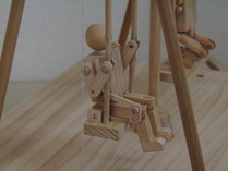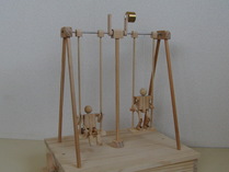 ブランコを少し揺らし、タイミングよくレバーを押すと人形が動き、立ちこぎや座りこぎをします。 なぜ? どんなしくみでブランコがこげるのだろう。立ちこぎと座りこぎの違いは何だろう。 |